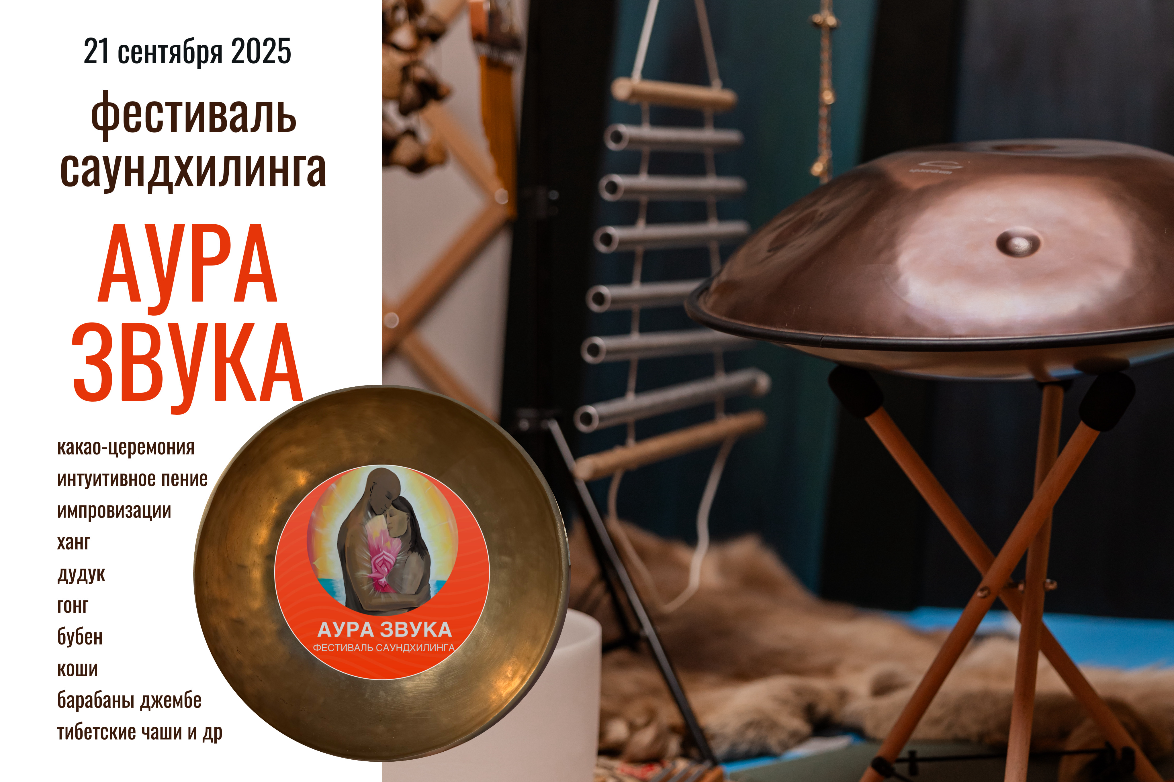 - живые инструменты: ханг, тибетские поющие чаши, гонг, бубны, дудук, пимак, барабаны джембе, варганы, гитары, колокольчики коши, бар-чаймс и другие,